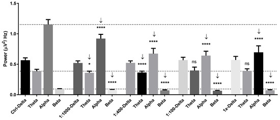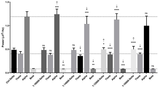 Power spectral analysis of human brainwaves characterized by frequencies consisting of delta, theta, alpha, and beta wave powers in control, 1:1000 dilution, 1:400 dilution, 1:100 dilution, and undiluted garlic oil groups. Not significant (ns), *, **, *** and **** represent no statistical differences, p < 0.05, and p < 0.01, p < 0.001, and p < 0.0001, respectively.