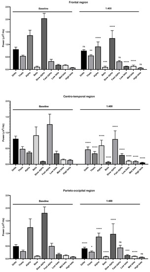 Effects of garlic oil inhalation at a 1:16,000 dilution on the delta, theta, alpha, beta, slow alpha, fast alpha, low beta, mid beta, and high beta wave powers: (upper) frontal region; (middle) centro-temporal region; (lower) parieto-occipital region. p value: not significant (ns) ≥ 0.05, * < 0.05, ** < 0.01, and **** < 0.0001.
