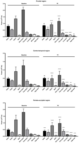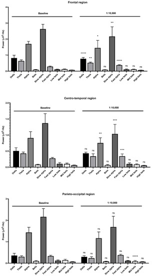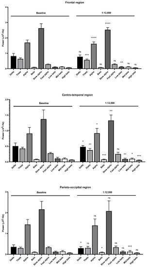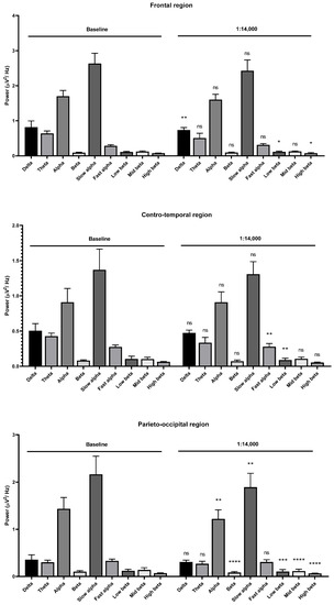 Effects of Litsea cubeba oil inhalation of an undiluted dilution (1X) on the delta, theta, alpha, beta, slow alpha, fast alpha, low beta, mid beta, and high beta wave powers: (upper) frontal region; (middle) centro-temporal region; (lower) parieto-occipital region. p value: not significant (ns) ≥ 0.05, ** < 0.01, *** < 0.001, and **** < 0.0001.