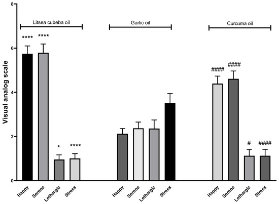 Effects of Litsea cubeba, garlic, and Curcuma longa oil inhalations on positive and negative moods; happy, serene, lethargic, and stress. p value compared Litsea cubeba oil with garlic oil: ns ≥ 0.05, * < 0.05, and **** < 0.0001. p value compared Curcuma longa oil with garlic oil: not significant (ns) ≥ 0.05, # < 0.05, and #### < 0.0001.