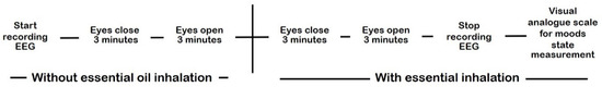 Experimental procedure divided into two trials: with and without essential oil inhalation. Three odors were applied for a volunteer with repeated protocols.