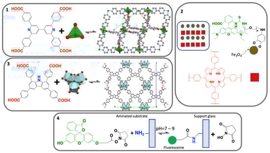 Recent nano-sized visual pH sensors. Box 1. MOF obtained from bipyridyl-tetracarboxylic in complex with Zn(II)-oxo specie derivative (green tetrahedral pyramid, oxygen red spheres, nitrogen blue spheres). Three-dimensional structure is obtained from Cambridge Structural Database (CSD) [83] with accession code 2019034 [84] Box 2. A nanocomposite pH VS is obtained from rhodamine B bound to a 3,4-dihydroxybenzaldehyde-polyethene glycol amino (DBI-PEG-NH2) functionalized with Fe3O4 (colored brown sphere) [85]. This composite is then mixed to meso-tetra (4-carboxyphenyl) porphyrin (red squares), and the overall mixture dispersed into a zirconium-based MOF (highlighted box) [86]. Box 3. MOF named BUT-62 is obtained from a fluorescent asymmetric ligand mixed to a zirconium oxo-complex (Zr cyan-polyhedron, O red spheres, N blue spheres; accession code 1446514) Box 4. pH VS from highly engineered nanomaterials. A “grafting” reaction causes binding of fluorescein molecule, as succinimidyl ester, to a glass (semi-transparent blue rectangle) coated with (3-aminopropyl)trimethoxysilane (APTMS, blue segment) [87]. Adapted from references indicated in square brackets.