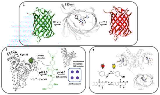 Bioengineered visual pH sensors. Box 1. Ribbon plot of Dendra2 protein [129]: chromophore appears as sticks (middle figure, nitrogen blue, oxygen red), accession code 2vzx [124]. Box 2. Ribbon plot representation of chimeric protein pHaROS [130] comprised of LOV protein, bound to its cofactor FMN (sticks), accession code 4hj3 [131], and GFP variant of mkate, accession code 3rwa [132]. A peptide linker is connecting LOV to mkate variant. Figure made with “UCSF Chimera” [133] for rendition purpose only and neither derived from experimental determination, nor theoretical calculation. Chemical structures of chromophore’s phenol group and flavin mononucleotide are represented. Box 3. Ribbon plot of bovine serum albumin, accession code 4f5s [134]. Under basic condition the sensor is linked to the side chain of Cys-34 and green fluorescence is produced [135,136]. Under acidic condition, the sensor can self-assemble (purple spheres) producing a non-fluorescent aggregate. Adapted from references indicated in square brackets.
