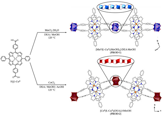 H2L-CuII was used to prepare two 2D MOFs [MnII(L-CuII)(MeOH)2]·DEA·MeOH (PROD-1) and [CoII(L-CuII)(DEA)]·8MeOH (PROD-2) with 1D MnII- or CoII-based SBUs, respectively (Figure 1). PROD-1 was prepared by heating H2L-CuII and MnCl2·2H2O in a mixture of DEA and MeOH to 120 °C for four days in a Teflon-lined stainless-steel autoclave. Slowly cooling this reaction mixture to room temperature afforded the formation of uniform, rod-shaped, crimson crystals of PROD-1. Similarly, PROD-2 was synthesised by heating H2L-CuII and CoCl2 in a mixture of DEA, MeOH and acetic acid (AcOH) under solvothermal conditions. After four days, this reaction mixture was slowly cooled to ambient temperature, resulting in the formation of red, plate-shaped crystals of PROD-2. Both products PROD-1 and PROD-2 form reproducibly, in good yields and were of suitable quality for analysis using single-crystal X-ray diffraction.
