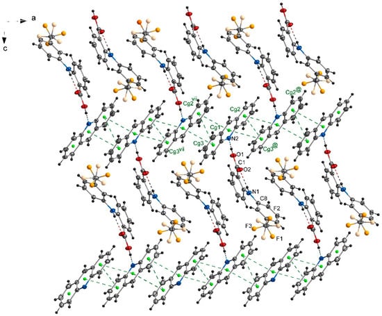 Packing diagram of crystal 1 viewed down the [010] direction showing arrangement of the complexes of acridine and flufenamic acid. Stacking interactions of acridine molecules are shown by green dashed lines linking centers of aromatic rings (centroids of rings-Cg-marked as green balls; Cg1 (N2/C21/C26/C27/C28/C33), Cg2 (C21/C22/C23/C24/C25/C26), Cg3 (C28/C29/C30/C31/C32/C33)). Symmetry codes: @ = −x, −y + 2, −z; vii = −x + 1, −y + 2, −z.