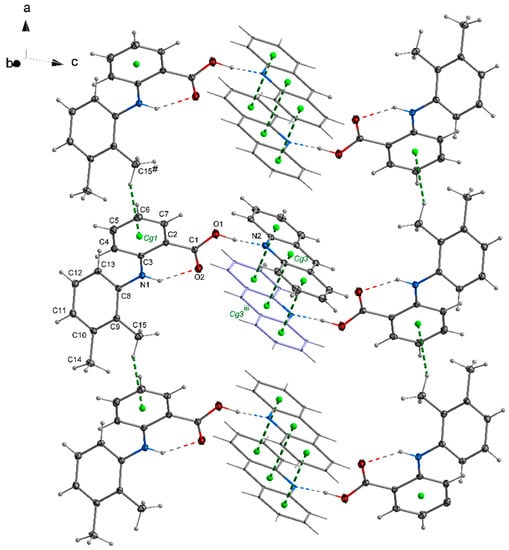 In the crystal 1, a chain motif extending along the [100] direction and composed of acridine molecules participating in stacking interactions is observed (Figure 2). The “branches” of the chain are formed by flufenamic acid molecules interacting with the acridine chain via O1–H1O…N2 hydrogen bonds. Flufenamic acid molecules that belong to the adjacent chains located in the crystallographic plane (010), are related by the 2-fold screw axis (½-x, ½+y, ½-z). The crystal of 2 reveals a double chain motif resembling “rungs of a ladder” extending towards the [100] direction (Figure 3). Within each of the chains, the molecules of mefenamic acid contact each other via C–H…π interactions (C15–H15b…Cg1#, # = x + 1, y, z) (Table S1, Supplementary Materials) while two adjacent chains are linked by π…π interactions of acridine rings forming “rungs of a ladder”. The analogous arrangement of complex components is observed in the crystal of tolfenamic acid with acridine (3) (Figure 4). Double chains stretching along the [100] direction are created by molecules of tolfenamic acid contacting each other via C13–H13…Clix (d(D…A) = 3.6977(16) Å; <(D–H…A) = 153°; ix = x–1, y, z), resulting in formation of chains between which the π…π stacked acridine molecules occur.