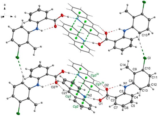 Packing crystal 3 showing arrangement of the complexes of acridine and tolfenamic acid. Stacking interactions of acridine molecules are shown by green dashed lines linking centers of aromatic rings (centroids of rings-Cg-marked as green balls; Cg1 (C28/C29/C30/C31/C32/C33); Cg2 (C21/C22/C23/C24/C25/C26); Cg3 (N2/C21/C26/C27/C28/C33)). Symmetry codes: iv = −x + 1, −y + 1, −z; # = x + 1, y, z.