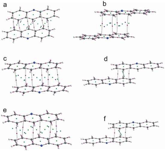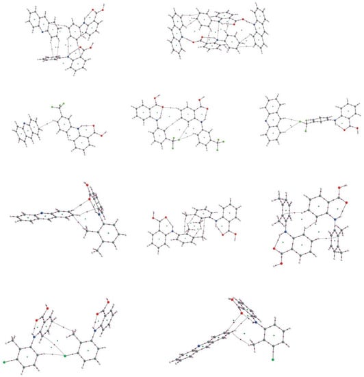 Stacking interactions between the acridine aromatic rings are expressed by the bond paths linking the carbon atoms of the interacting rings. In Figure 7, the QTAIM diagrams for the interacting acridine rings for the investigated complexes are presented.