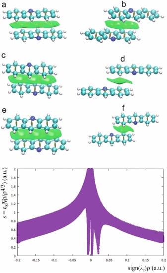 To characterize more precisely very weak interactions, the Noncovalent Interaction (NCI) approach can be applied [7]. This method uses two types of visualization of very weak hydrogen bonds, van der Waals interactions, dispersion and steric repulsion—the NCI plot and NCI surface. The NCI plot is a function of the reduced density gradient versus the electron density multiplied by the sign of the second Hessian of electron density eigenvalue (λ2). The spikes located at the negative values indicate the attractive noncovalent interactions. The spikes at the positive values correspond to the steric repulsion. Two spikes symmetrically located around the zero value in the NCI plot indicate the presence of the dispersive interaction. The second visualization method of noncovalent attractive interaction and steric repulsion used in the frame of NCI approach is the gradient iso-surfaces in real space for the molecule. The traditionally used color for the iso-surfaces is green for attractive, and red for the repulsive interaction.