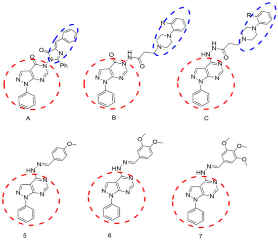 Thus, it was the goal of this study to design and synthesize a group of compounds that comprise the N-aryl pyrazolo[3,4-d]pyrimidine scaffold having different arylidenehydrazino substitution at the 3-, 4- and 5-positions (compounds 5–7) and to test their anticancer activity. Synthesized compounds are expected to retard the progression of malignancies. The substitution pattern of the synthesized compounds was carefully selected so as to confer different electronic and lipophilic properties to molecules.