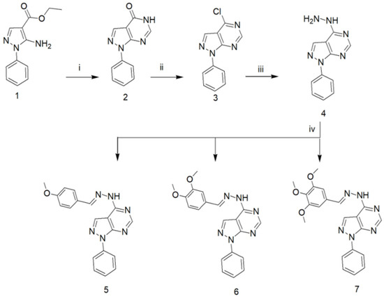 Synthetic pathway for the synthesis of the target compounds 5–7; reagents and reaction conditions: i: HCONH2, reflux, 10 h; ii: POCl3, reflux, 4 h; iii: NH2NH2, EtOH, reflux, 6 h; iv: ArCHO, EtOH, reflux, 3 h.