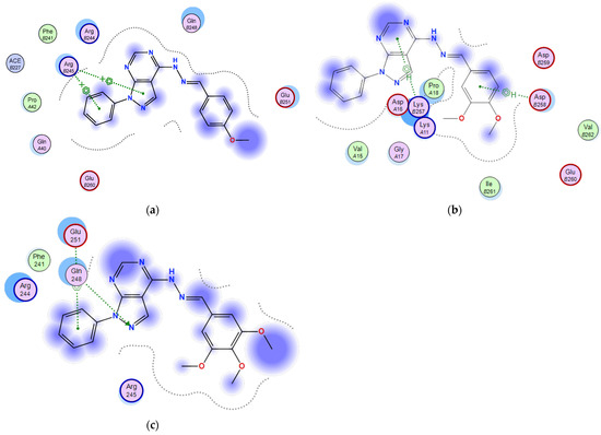 The binding mode of 6 (Figure 4b) showed a binding score equal to (−5.0599). The X-ray crystal structure revealed arene–H binding between the phenyl ring and Asn208, in addition to hydrophobic interactions with several amino acids. Figure 4c shows the binding mode of 7, indicating a binding score of (−5.7119). Furthermore, it indicates the presence of an arene–cation bonding between Arg64 and the pyrazolo-phenyl ring together with a hydrogen bonding between the pyrazolo-N and Arg207. Furthermore, two water molecules were involved in a bond between the phenyl ring and Phe250, in addition to the hydrophobic interactions with several other amino acids.