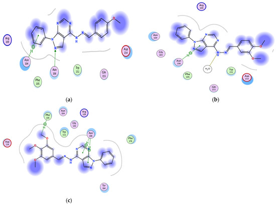 Figure 6c shows the binding mode of 7, indicating a superior binding score of (−5.1502) relative to 5 and 6 (−4.0295 and 4.7846, respectively). Furthermore, three arene–H bondings between the methoxy and Phe105, the pyrimidine and Asn106, and finally the pyrazole ring and Asn106, in addition to the hydrophobic interactions with several other amino acids. Surprisingly enough, water molecules were not involved in any of the bonding between the protein and any of the tested compounds, despite its involvement in the binding between the protein and the reported ligand.