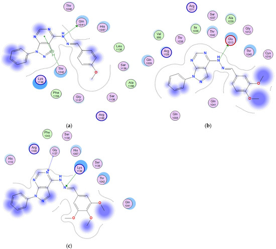 Figure 8c shows the binding mode of 7, indicating a binding score of (−6.3091). Furthermore, it showed two hydrogen bondings, one between the hydrazono-N and Lys1136 and the other between the pyrimidine-N and Gly1137, in addition to the hydrophobic interactions with several other amino acids.