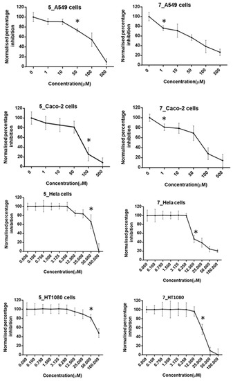 Normalised percentage cell viability inhibition of compounds 5 and 7, measured by three independent MTT assays in A549 and Caco-2 cell lines and by three independent experiments with crystal violet staining in Hela and HT1080 cell lines. Cells were treated with different concentrations (from 1 and up to 500 µM) of the compounds for 48 h, * = first concentration significant reduction in cell viability in comparison to the control.