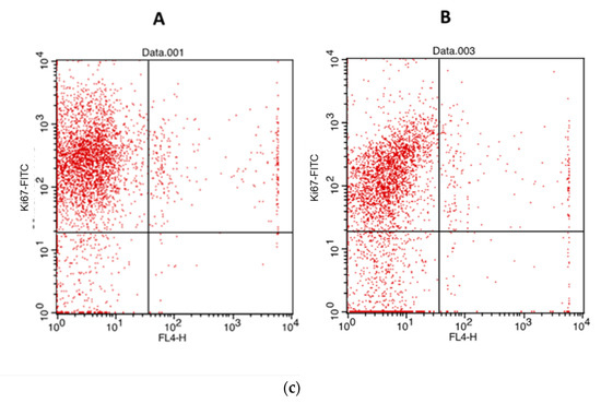 Ki67 expression was determined using a flow cytometry assay. Ki67 expression was found to decrease significantly following the cells’ treatment using compound 7 at IC50 concentration for 48 h (Figure 10c). The percentage of cells labelled using Ki67 antibody in the control cells was 85.61%, whereas those labelled with the same antibody following treatment with compound 7 was 68.06%. We demonstrated that Ki67 expression was significantly reduced in the cells treated with compound 7.