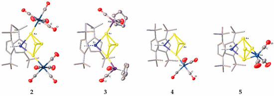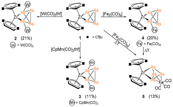 - Scherer, O.J.; Vondung, J.; Wolmershäuser, G. Tetraarsacyclobutadien als Komplexligand. J. Organomet. Chem. 1989, 376, C35–C38. [Google Scholar] [CrossRef]