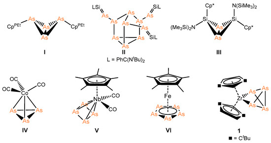 - Schmidt, M.; Konieczny, D.; Peresypkina, E.V.; Virovets, A.V.; Balázs, G.; Bodensteiner, M.; Riedlberger, F.; Krauss, H.; Scheer, M. Arsenic-Rich Polyarsenides Stabilized by Cp*Fe Fragments. Angew. Chem. Int. Ed. 2017, 56, 7307. [Google Scholar] [CrossRef]