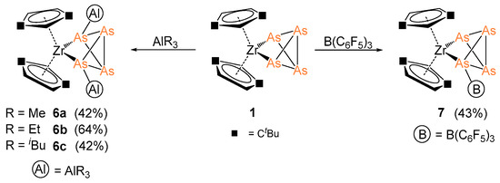 3.2.5. Synthesis and Characterization of [Cp″2Zr(µ3,η1:1:1:1-As4){AlR3}2] (R = Me (6a), Et (6b), iBu (6c))