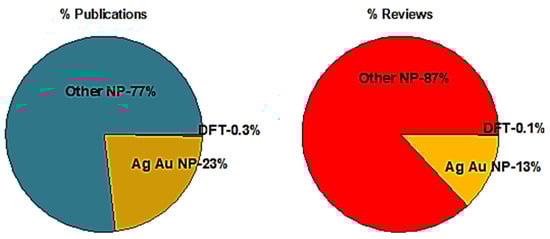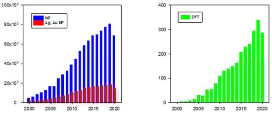 From 2000 to 2020, according to SciFinder, of the 852,987 papers that were published on NPs, 23% (197,080 papers) were on Au or Ag NPs. Though density-functional theory (DFT) is an important tool for the study of any process mechanism at the molecular level, only 2562 of these papers (1.3% of the publications on AuNPs or AgNPs) used DFT calculations, a number that represents only about 0.3% of all publications on NPs (Figure 1). Molecular dynamics is used only after the nascent NPs are formed to calculate their growth to their final size and shape [,,,,,,]. In addition to original research, about 51,000 reviews of the work on NPs were published, of which 6612 (13%) were also on AuNPs or AgNPs, but only 41 of these include DFT calculations (Figure 2). Insofar as DFT calculations are the most common method to theoretically explore a process, the limited number of publications that exploited DFT indicates that the theoretical study of the production of AgNPs and AuNPs has received limited attention.