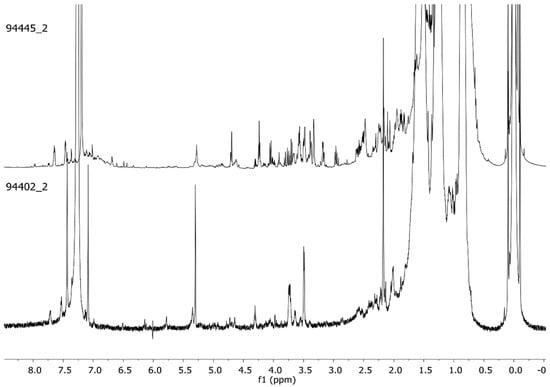 Representative 1H-NMR profiles (CDCl3, 600 MHz) of the red pigment’s organic fraction extracted from scraped bone (94402_2) and by sonication of the bone segment (94445_2).