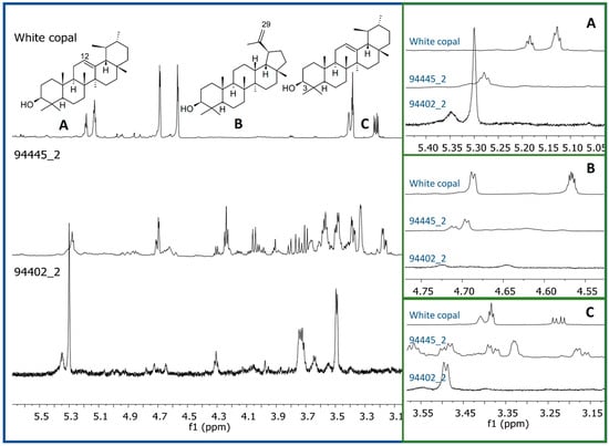 Comparison of the 1H-NMR profiles (CDCl3, 600 MHz) from two representative pigment samples (scraping and sonication) with those of white copal showing the characteristic signals: (A) H-12 from α and β-amyrin, (B) H-29 from lupanes, and (C) H-3 from α and β-amyrins.