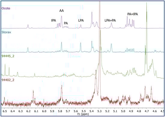 Comparison of the 1H-NMR profiles (CDCl3, 600 MHz) from two representative pigment samples (scraping and sonication) with those of ocote and storax resin showing some characteristic resonances from abietane diterpenes: levopimaric (LPA) (H-8, δ5.49; H-6, δ5.11), abietic (AA) (H-8, δ5.78), pimaric (PA) (H-13, δ5.72; H-8, δ5.15; H-14, δ4.95, and 4.91), and isopimaric (IPA) acids (H-14, δ5.81; H-15, δ4.93, and δ4.87).