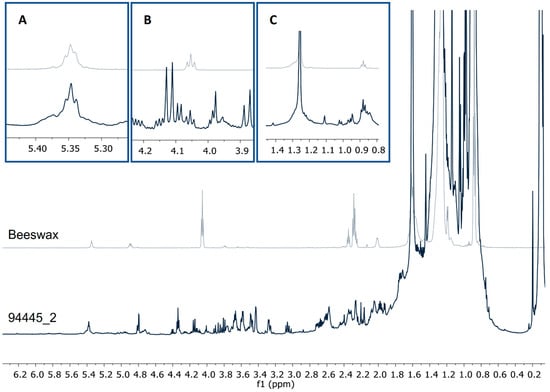1H-NMR profiles (CDCl3, 600 MHz) from a pigment sample and beeswax showing the signals from (A) vinylic protons δ5.35, (B) ester 1° alcohol δ4.04, t, and (C) methyl protons δ0.88, t.