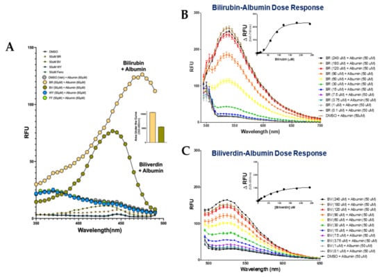 We next determined the binding of bilirubin to albumin via fluorescence using the 465 nm excitation measuring in the 540–700 nm as previously shown [9]. An increasing dose of bilirubin was used in the presence of albumin to determine the maximal shift in autofluorescence. A Gaussian curve was fit to each spectrum, revealing a dose-dependent increase in fluorescence (Figure 1B). As in previous studies, the maximum fluorescence (Fmax) was recorded and defined as the peak fluorescence intensity within the emission spectra for each condition [9]. To create a dose–response curve, ΔRFU values were calculated by subtracting the Fmax recorded with bilirubin alone at a given concentration from the Fmax at the same concentration but in the presence of albumin. These values were used as the ΔRFU for subsequent analysis to determine the specific binding. For affinity analysis, the specific binding Fmax per condition was plotted against the concentration of bilirubin, and a non-linear line was fit to the graph. The disassociation constant (Kd) was calculated using the fitted line and was determined to be the concentration in which half of the maximum fluorescence was achieved. A line fit to the Fmax at each concentration revealed a Kd value of 11.10 μM for bilirubin-bound albumin. To further analyze the biliverdin-bound albumin autofluorescence, we measured fluorescence using the 440 nm excitation over the 525–650 nm spectra as these were the peak values for biliverdin in Figure 1A. The results in Figure 1C show a dose-dependent increase in fluorescence for biliverdin bound to albumin.