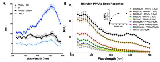 We found that bilirubin bound to albumin autofluoresces in a dose–response relationship and show bilirubin bound to PPARα autofluoresces in a similar manner. We present bilirubin’s binding capacity with specific amino acids in the PPARα LBD and show that this can be quantitated based on its autofluorescence.