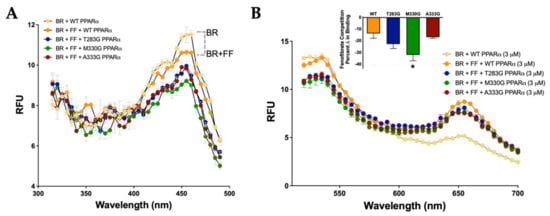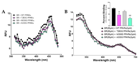 PPARα has a single low-fidelity ligand-binding pocket. Our previously published in silico docking analysis revealed several predicted residues that bilirubin might interact in the PPARα LBD by hydrogen bonding to stabilize binding [3]. Therefore, we explored how mutating the predicted hydrogen bonding sites of interaction might affect bilirubin’s binding capacity. Mutations were made in our histidine-tagged WT PPARα (His-PPARα) vector via the substitution of glycine at the following sites: Threonine 283 (T283G), methionine 330 (M330G), and alanine 333 (A333G). We measured the emission set at 540 nm for WT PPARα and mutants. The results show a reduction in the maximal fluorescence between the mutants and WT (Figure 3A). The maximal excitation fluorescence of bilirubin bound to PPARα was found to be at 455 nm, which was used in the next analysis to determine which amino acids are bound by bilirubin. Using the WT PPARα and mutants at an excitation of 455 nm, the wavelengths were measured in 530–700 nm spectra, and the ΔRFU was calculated for subsequent analysis to determine the specific binding (Figure 3B). There was a significant decrease in bilirubin-induced fluorescence for PPARα mutants T283G (vs. WT, p < 0.05) and A333G (vs. WT, p < 0.01). There was no significant decrease in fluorescence between the WT and PPARα mutant M330G (p = 0.3673).