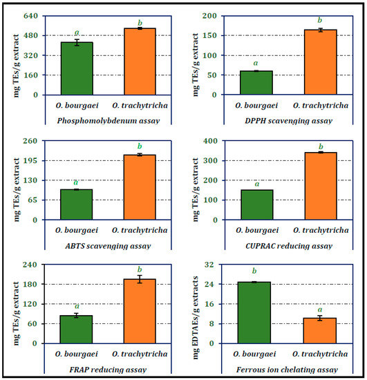 Total antioxidant, radical scavenging, reducing power and chelating activity of the MeOH extracts of O. bourgaei and O. trachytricha [TEs: Trolox equivalents, EDTAEs: Ethylenediaminetetraacetic acid (disodium salt)]. Data with different superscripts (a, b) were different from each other. All tests were performed in triplicate.