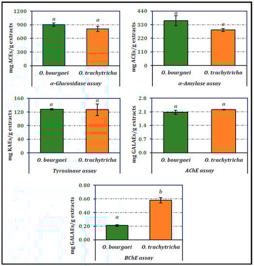 Enzyme inhibition activities of the MeOH extracts of O. bourgaei and O. trachytricha (KAEs: Kojic acid equivalents, GALAEs: Galanthamine equivalents, ACEs: Acarbose equivalents). Data with different superscripts (a, b) were different from each other. All tests were performed in triplicate.