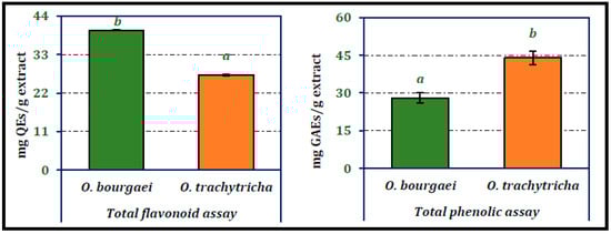 Total phenolic and flavonoid contents of the MeOH extracts of O. bourgaei and O. trachytricha (QEs: Quercetin equivalents, GAEs: Gallic acid equivalents). Data with different superscripts (a, b) were different from each other. All tests were performed in triplicate.