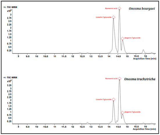 Chromatographic analyzes were carried out to determine the amounts of some phytochemicals in the extracts. The analytical characteristics of these phytochemicals are presented in Table 1. The LC-MS/MS chromatograms of selected phytochemicals in MeOH extracts were given in Figure 4 and as µg/g extract in Table 2. As can be seen from the chromatograms in Figure 4, the main compounds of both O. bourgaei and O. trachytricha were luteolin 7-glucoside (23,908.22 and 22,326.01 µg/g extract, respectively), rosmarinic acid (10,013.76 and 24,837.51 µg/g extract, respectively) and apigenin 7-glucoside (21,689.17 and 17,949.03 µg/g extract, respectively). Many compounds selected were in high quantities in O. trachytricha extract. However, it was found that some phytochemicals such as pinoresinol, luteolin 7-glucoside, gallic acid, luteolin, eriodictyol, apigenin 7-glucoside, and verbascoside were in higher amounts in O. bourgaei extract than O. trachytricha.