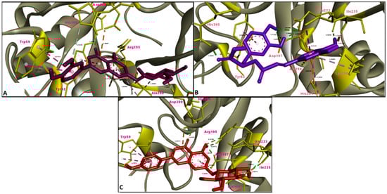 Molecular interaction between butyrylcholinesterase (BChE) and (A) luteolin 7-glucoside, (B) rosmarinic acid and (C) apigenin 7-glucoside.