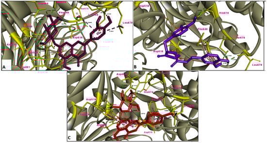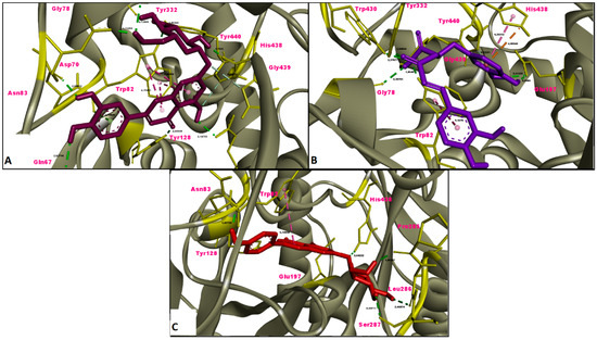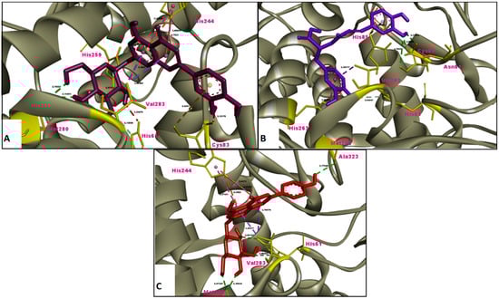 Molecular interaction between α-glucosidase and (A) luteolin 7-glucoside, (B) rosmarinic acid and (C) apigenin 7-glucoside.