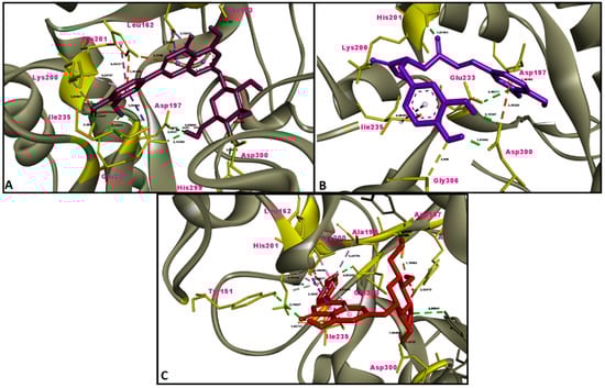 Molecular interaction between α-amylase and (A) luteolin 7-glucoside, (B) rosmarinic acid and (C) apigenin 7-glucoside.
