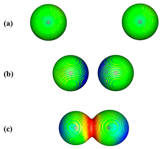 In Figure 1b, the atoms are 5.0 Ǻ apart and beginning to interact. The regions facing each other are now slightly less positive than the rest of the surfaces, due to the slight polarization of each atom’s electronic density toward the other, as predicted by Feynman.