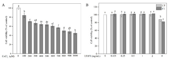 Cytotoxicity evaluation. (A) Cytotoxicity of CoCl2. (B) Cytotoxicity of UT and FT extracts. Means with different small letters were significantly different (p < 0.05).