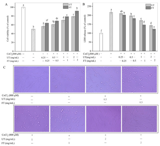 Protective effects of UT and FT extract on CoCl2-induced injury. (A) Cell viability. (B) LDH level. (C) Cell morphology. Means with different small letters were significantly different (p < 0.05).