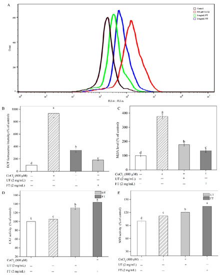 Protective effects of UT and FT extracts on CoCl2-induced oxidative stress. (A) ROS level. (B) The DCF fluorescence intensity measured using a BD AccuriTM C6 Flow cytometer. (C) MDA level. (D) CAT. (E) SOD. White, patterned, light gray, and dark gray indicated untreated control (without CoCl2, UT and FT), only CoCl2-treated, UT + CoCl2-treated, and FT + CoCl2-treated group. Significant differences between any two groups above were checked. The small letters (a, b, c, and d) indicated the ordering of highness of each group, since “a” means the highest yield and “d” means the smallest amount. Every group was used as control to compare the difference in this figure. Means with different small letters were significantly different (p < 0.05).