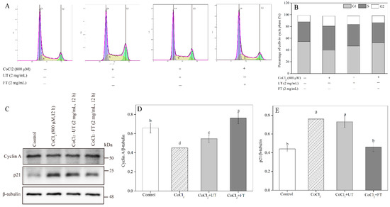 Profound cell cycle alterations can result in cell death [35]. As shown in Figure 6A,B, an obvious S-phase cell cycle arrest was observed in CoCl2-treated cells. The cell number at the S phase significantly increased by 21.47% and the cell number at the G1 phase decreased by 26.84% compared to control. The S-phase cell cycle arrest induced by CoCl2 was significantly inhibited by UT and FT treatments. For example, the cell number at the S phase decreased by 16.21% and the G1 phase cell number increased by 31.16% in FT extract-treated group compared with those in hypoxic control. The crucial proteins involved in the cell cycle, including cyclin A and p21, were measured to study the cellular mechanisms (Figure 6C–E). The cyclin A protein level in PC12 cells suffered a significant decrease after CoCl2 treatment, which reduced by 31.51% compared to control. At the same time, a significant increase (72.34%) in the p21 protein level was observed in the CoCl2-treated group. The observed S-phase cell cycle arrest induced by CoCl2 was significantly attenuated by UT or FT extracts through significant up-regulation of the cyclin A protein level and down-regulation of the p21 protein level in PC12 cells. FT exhibited a more significant inhibitory effect on CoCl2-induced S-phase arrest than UT through improving a higher expression level of cyclin A protein and limiting p21 protein expression.