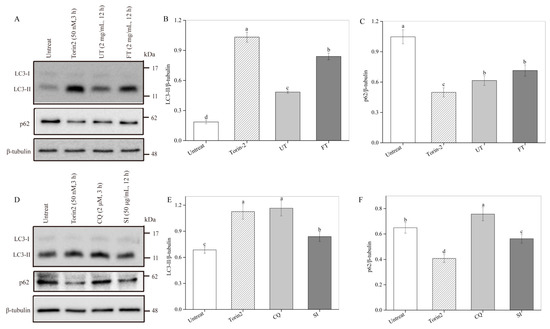 PC12 cells were cultured on a 6-well plate at a density of 2.8 × 105 cells/well at 37 °C for 12 h. Then cells were exposed to UT or FT extracts (2 mg/mL) for 12 h at the same time. The adherent cells were lysed in RIPA buffer and then centrifuged at 10,000× g and 4 °C for 10 min. The autophagy pathway proteins, including LC3 and p62, were analyzed using western blot.