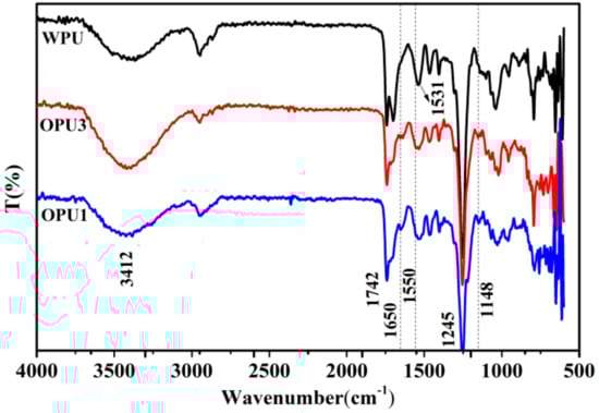 Representative FTIR spectra of OPUs are presented in Figure 1. The typical absorption peaks at 3412 cm−1, 1742 cm−1, and 1245 cm−1 are related to the stretching vibration of N-H, C=O, and C-O in the urethane groups of polyurethane. The N-H bending and the C-N stretching vibrations in the urethane groups are also observed near 1531 cm−1. Moreover, no obvious absorption peak around 2270 cm−1 ascribed to the isocyanate group (-NCO) has been detected, indicating the complete reaction of -NCO and –OH groups. All these peaks demonstrated the formation of polyurethane chains.