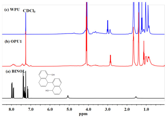 1H NMR spectra of BINOL, OPU1, and WPU: (a) BINOL, (b) OPU1, (c) WPU.