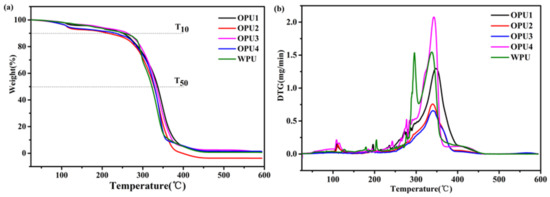 The thermal stability of OPUs was characterized by TGA and DTG curves, as shown in Figure 3. In Figure 3a, the slight weight loss at around 110 °C is due to the residual water extraction as a result of heating. The main weight loss occurs in the range of 250–310 °C and 310–460 °C, corresponding to the decomposition of urethane bonds and the soft segments, respectively. In Figure 3b, WPU shows a distinct two-step weight loss, while OPUs presents onset weight loss. The decomposition temperatures of 10% weight loss (T10) of OPU3 and WPU are similar, which are slightly higher than other samples. In addition, the decomposition temperatures of 50% weight loss (T50) of OPU1 (337 °C) and OPU3 (333 °C) are enhanced by 5–15 °C, compared to WPU (322 °C), OPU2 (326 °C), and OPU4 (328 °C). Therefore, the above results indicate that OPU3 synthesized with BIMOL and BDO at mole ratio 1:1 presents better thermal stability.