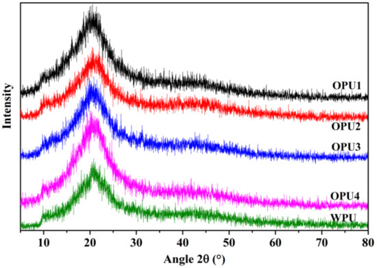 The XRD patterns were obtained to detect the structural feature of OPUs, as depicted in Figure 4. The broad characteristic peak around 20.8° for both WPU and OPUs indicates the amorphous structure and nonanisotropic behavior of the synthesized polyurethanes. Overall, both WPU and OPUs show the amorphous structure as per the XRD patterns. The amorphous structure of OPUs is due to the presence of a rigid naphthyl ring that limits the movement of the polyurethane chains, leading to difficulties in crystallization [22].