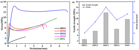 Stress–strain curves of WPU and OPUs (a) and the extracted values of tensile strength and stress (b).