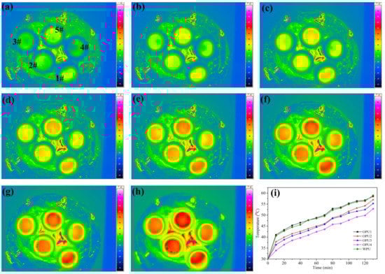 Infrared thermography of WPU and OPUs: (a) 0 min, (b) 20 min, (c) 40 min, (d) 60 min, (e) 80 min, (f) 100 min, (g) 120 min, (h) 140 min, (i) The variation of the surface temperature with time.